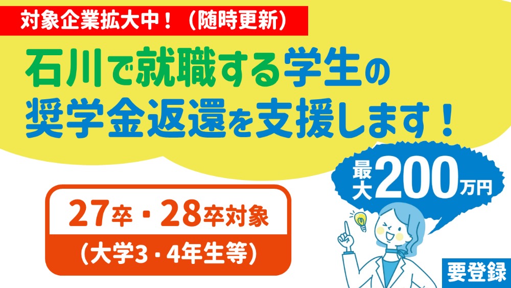 【R5~R7】「いしかわ理系人材確保奨学金返還助成制度」についてはこちら奨学金返還支援に取り組む石川県内の市町